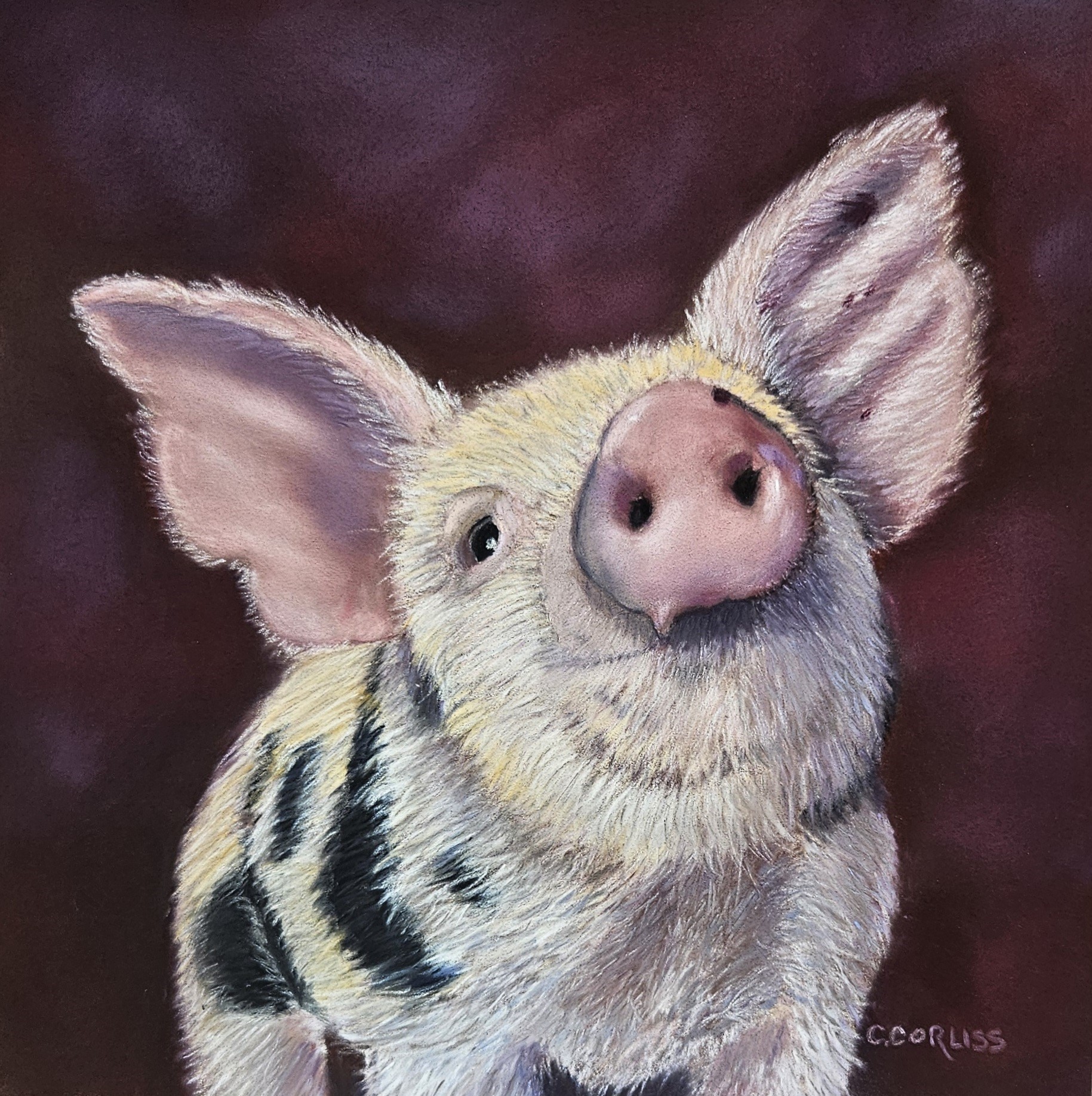 "Chin Up" also won the Judges Award in the Pastel Society of NH Member Show. The Judge was Cindy House - here are her comments: "The artist skillfully presented this little pig with attitude and oodles of cuteness, but in doing so she showed her expertise in handling pastel. The simple composition is chosen with the subject in mind. I like the way she blended the background into the subject itself. She made you want to stroke its fur and poke its rubbery nose! Congratulations, Carol".